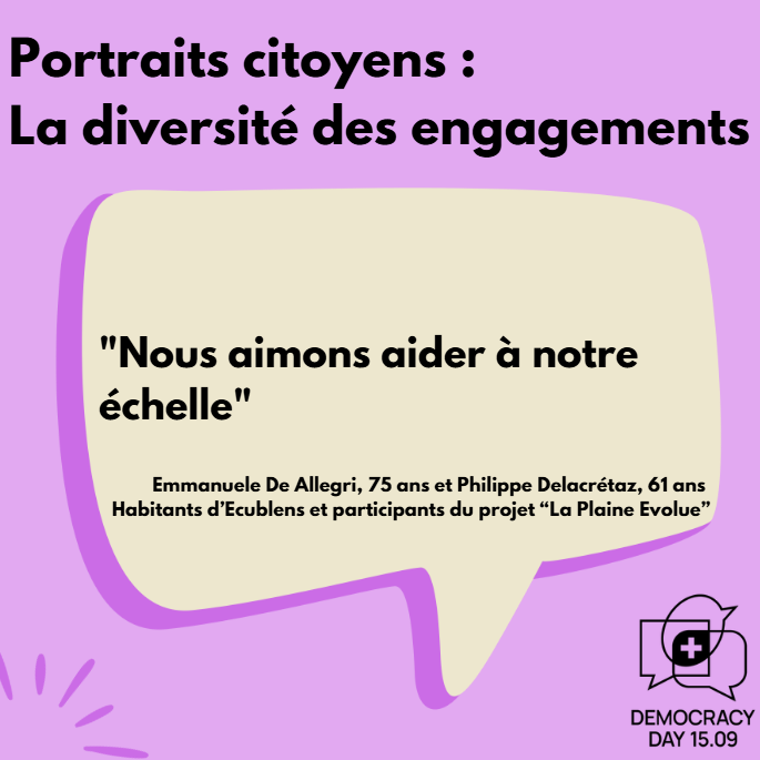Emmanuele et Philippe sont deux participants actifs du projet La Plaine Evolue, une initiative qui invite les habitants d'Ecublens à exprimer leurs besoins et attentes à travers des ateliers participatifs. Bien qu'ils abordent l'engagement de manière différente, leur participation à ce projet reflète un désir commun de rendre leur environnement plus vivant et plus solidaire.